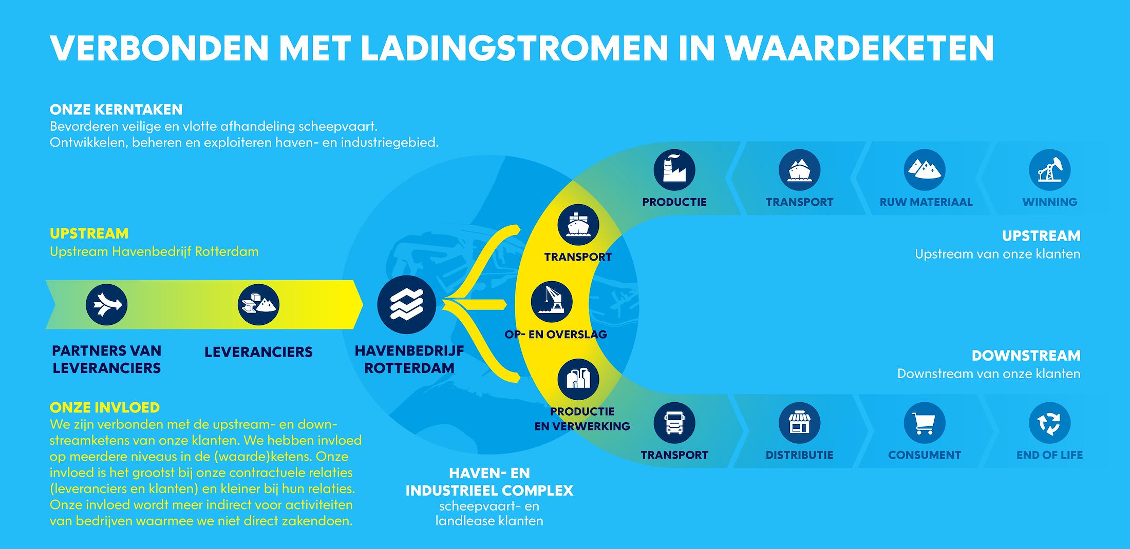 De Rotterdamse haven speelt een belangrijke rol in wereldwijde logistieke ketens. Onze klanten, waaronder gevestigde bedrijven en zeevaart, maken deel uit van deze ketens. Als havenbeheerder hebben we beperkte invloed op de ladingstromen, maar zijn we wel verbonden met de upstream- en downstreamketens van onze klanten. Onze invloed benutten we door de dialoog aan te gaan met partners en stakeholders, gericht op veilige handel en het beperken van negatieve maatschappelijke impact. De samenleving kijkt steeds kritischer naar de herkomst van goederen en spreekt ons daarop aan. We gaan actief in gesprek met stakeholders over risico's in de waardeketen, zoals in 2025 bij acties rond kolen en wapens.