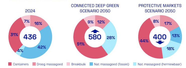 In elk scenario groeit het containervervoer, mede door toenemende bevolking, productie en welvaart. Nieuwe grondstoffen komen grotendeels per container binnen. Fossiele nat massagoederen nemen sterk af, terwijl hernieuwbare alternatieven zoals waterstof(dragers), pyrolyseolie en plantaardige olie juist fors groeien. Rotterdam loopt hierin voorop en ontwikkelt zich tot de belangrijkste Europese hub voor deze stromen. Binnen droog massagoed groeit biomassa. Rotterdam blijft concurrerend en aantrekkelijk voor duurzame logistiek.
